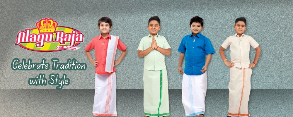 Classic South Indian dhoti & shirt sets for boys aged 0–14.