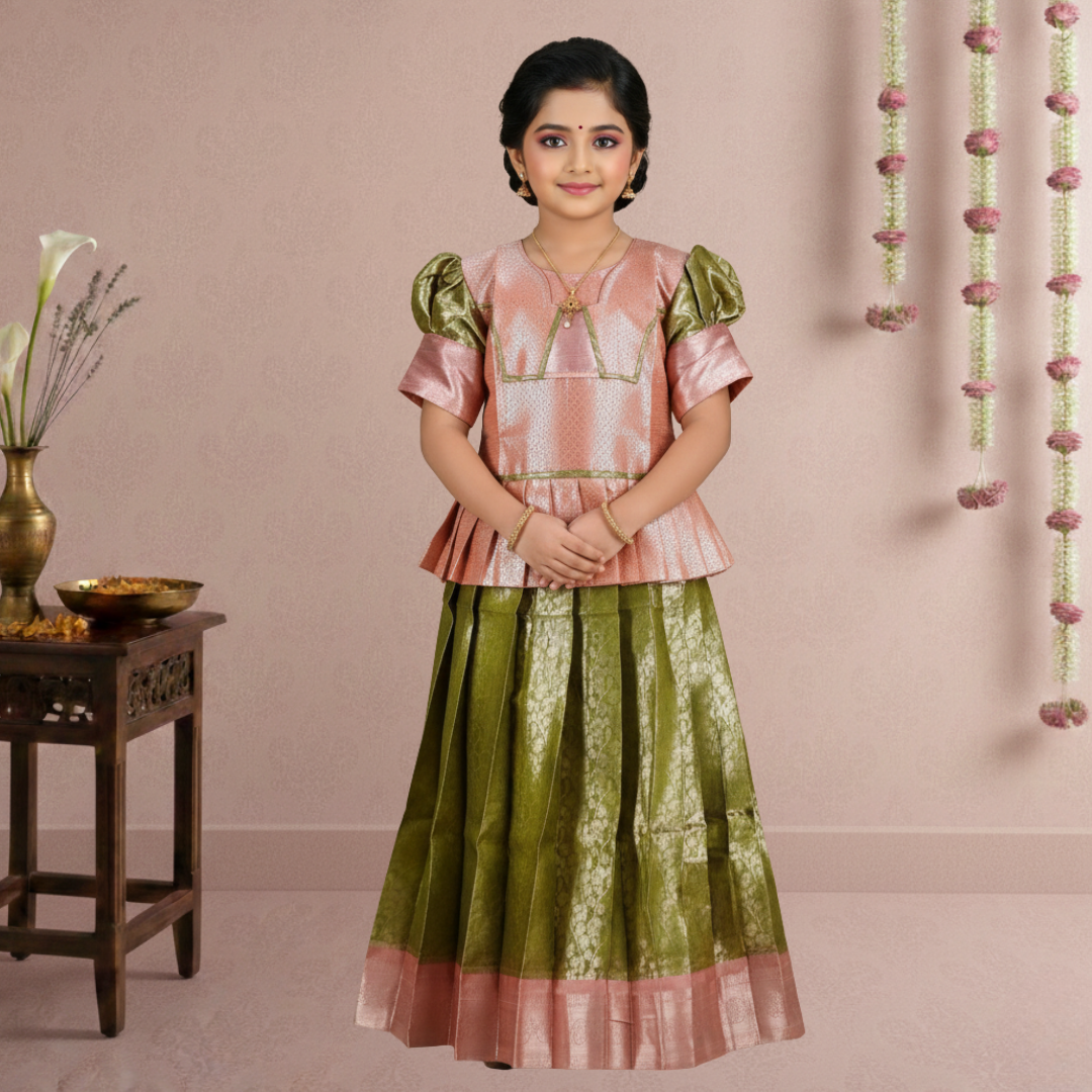 Green & Pink Pattu Pavadai | Girls Traditional Wear |Kids Ethnic Wear